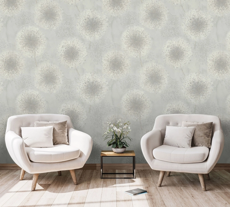 На поверхности обоев изображены искрящиеся одуванчики, выполненные нежно и легко. Утонченные линии с эффектом металлика расходятся от центра, а мягкий градиент создает ощущение динамики и движения, будто воздушные семена вот-вот унесет летний ветер.