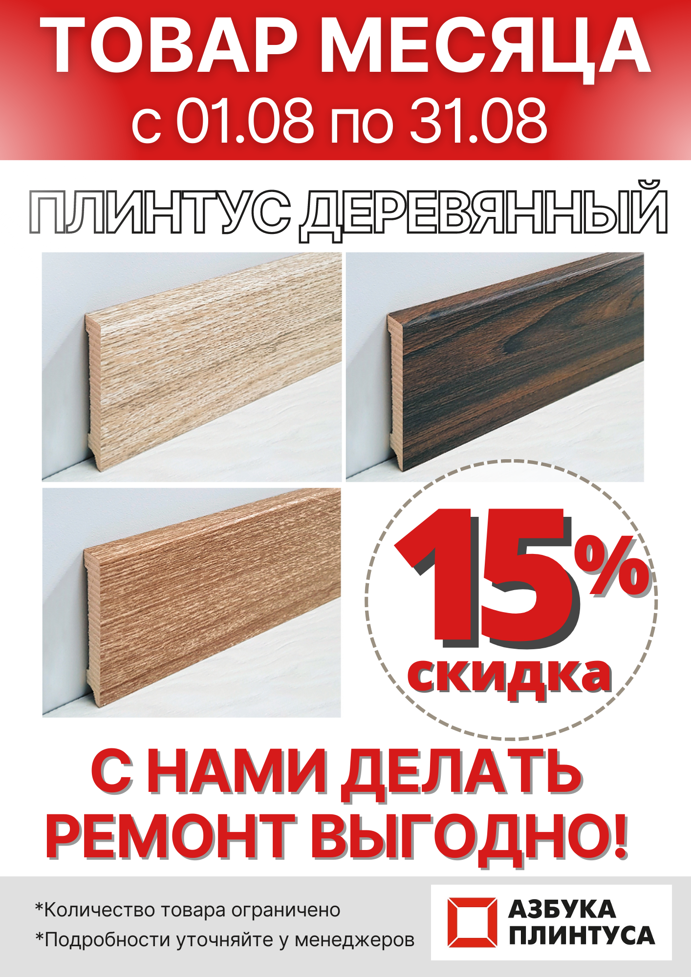 - 15% на весь ассортимент ламинированного ДЕРЕВЯННОГО ПЛИНТУСА ИЗ СИБИРСКОЙ СОСНЫ Размер 80*16*2400 мм